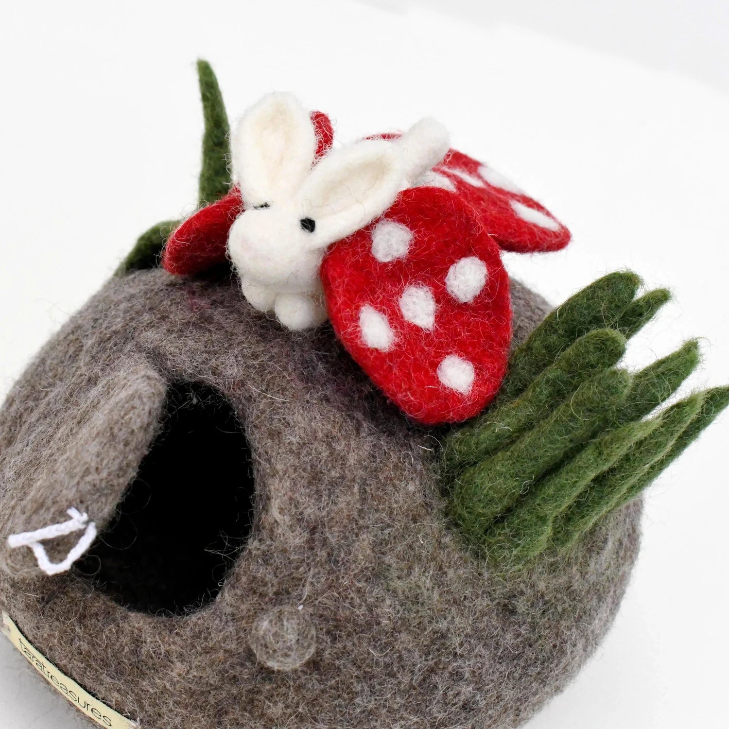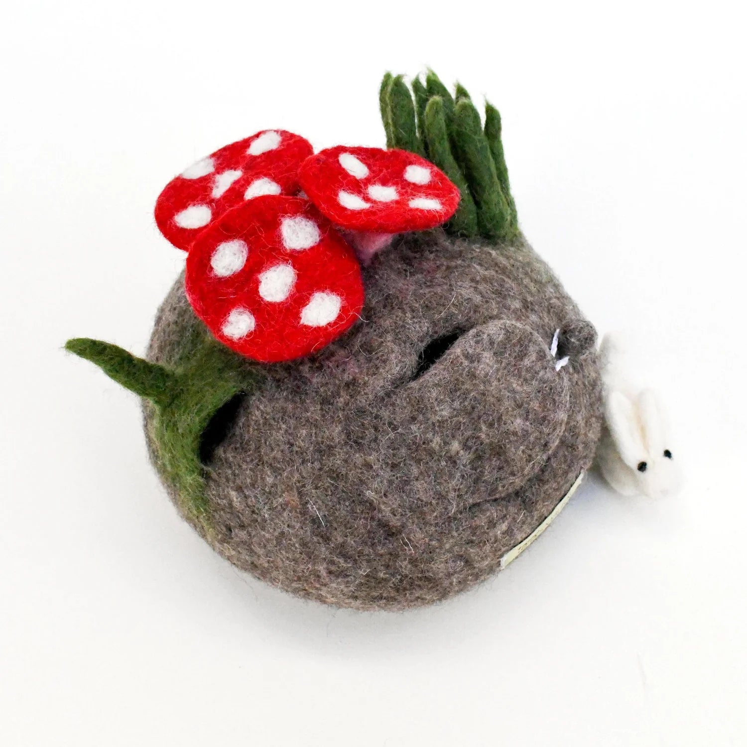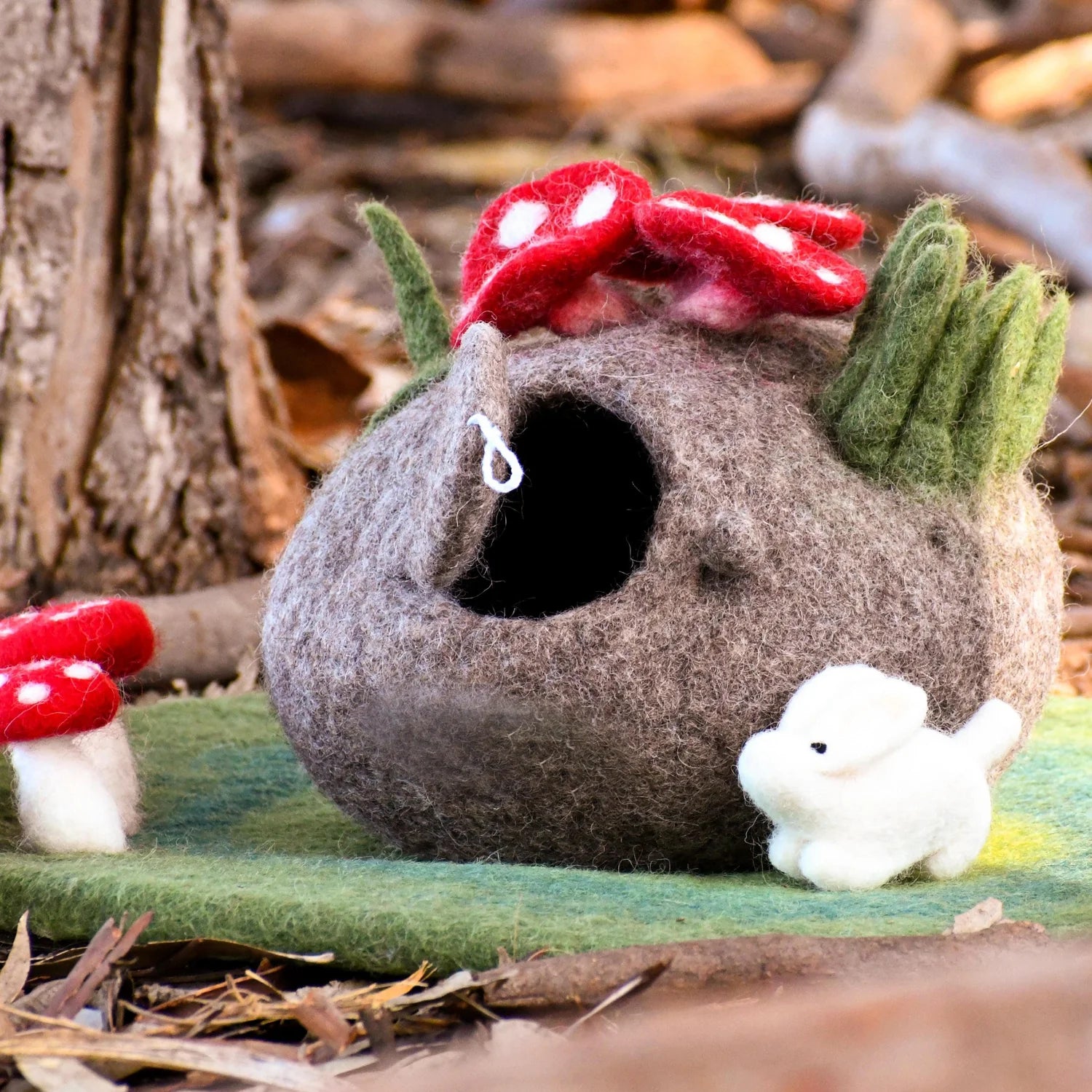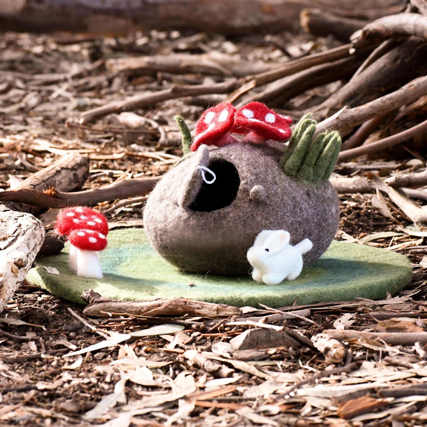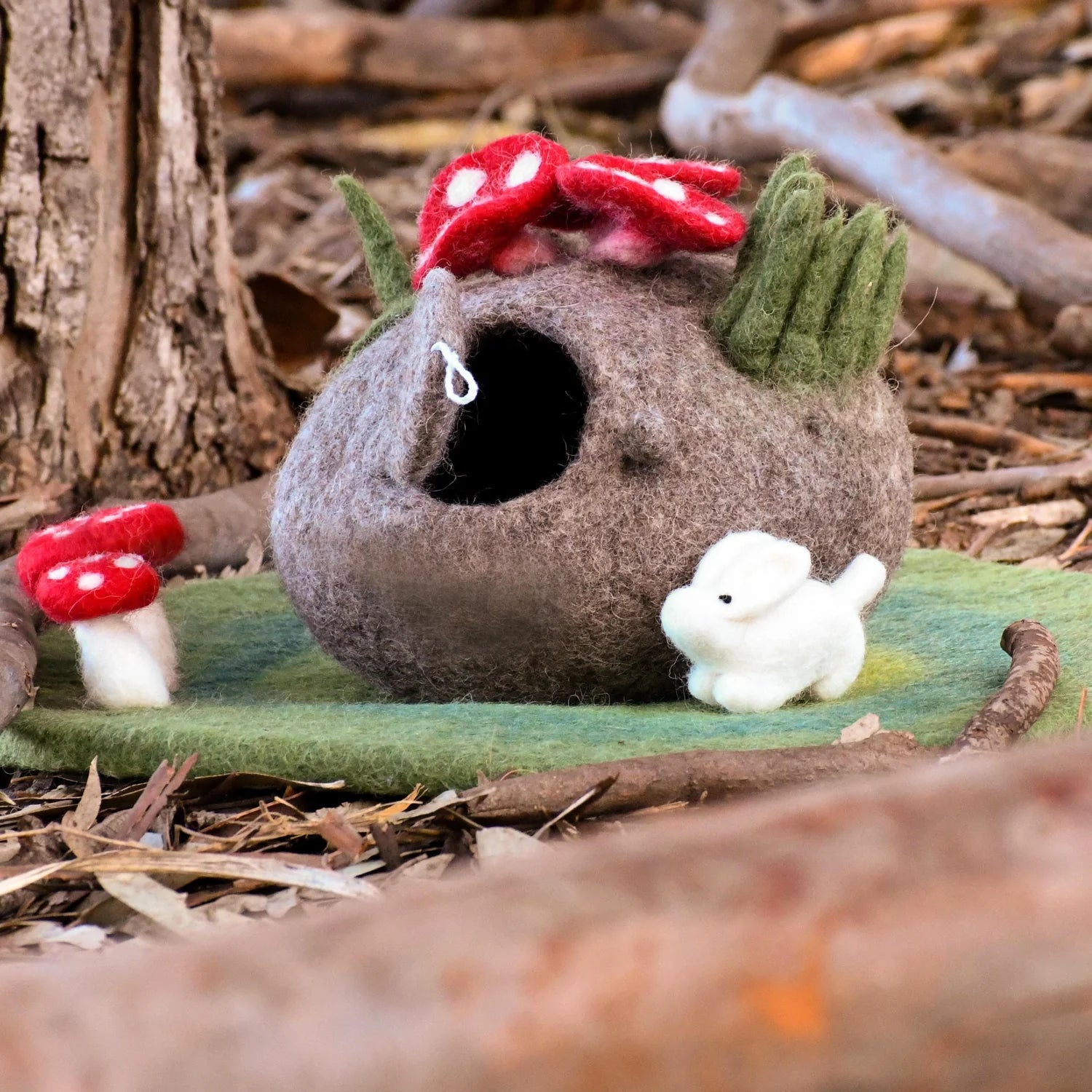 Spark imaginative play with our felt fairy toadstool house, featuring a tiny white rabbit inside. This sensory toy lets little ones open and close the door to discover the needle-felted rabbit, encouraging curiosity and fine motor skills. The toadstool also doubles as a cozy hiding spot for their favorite treasures.